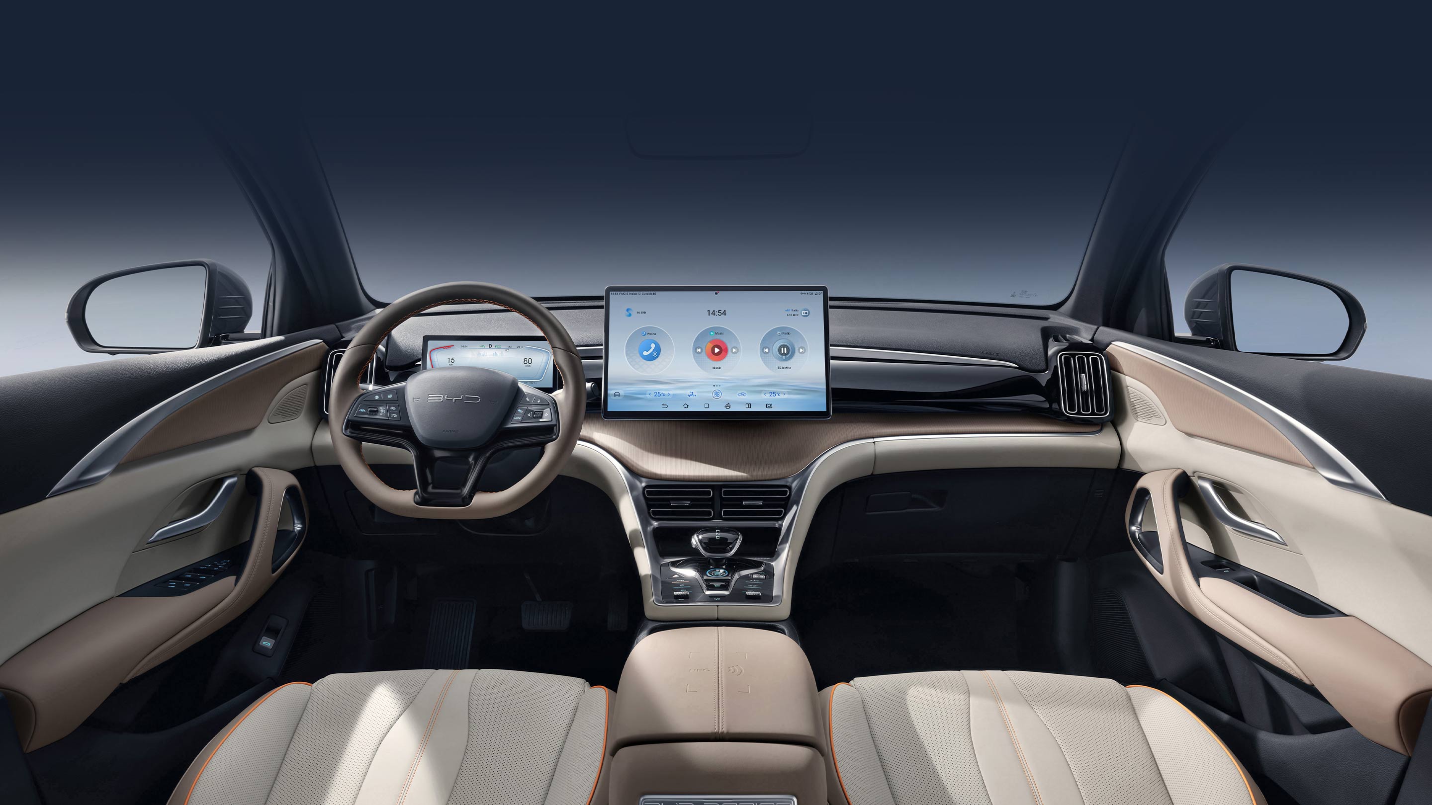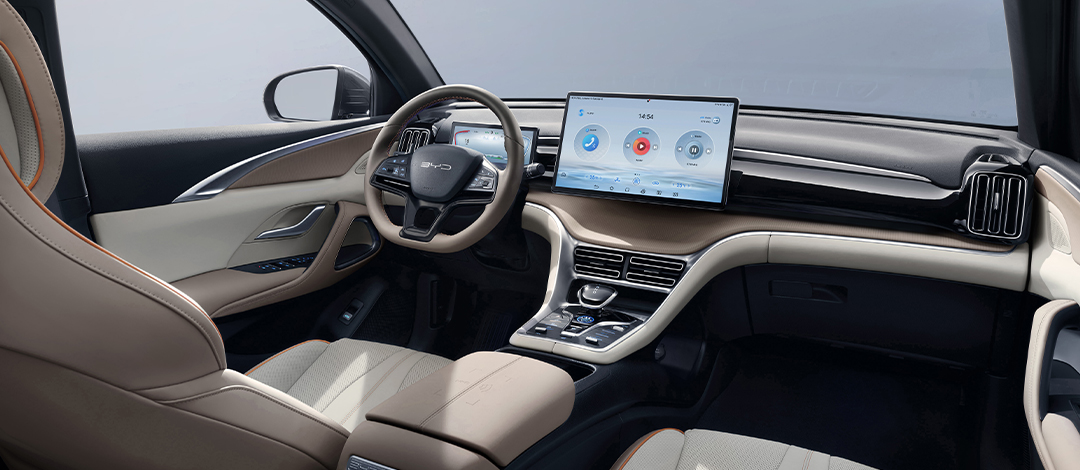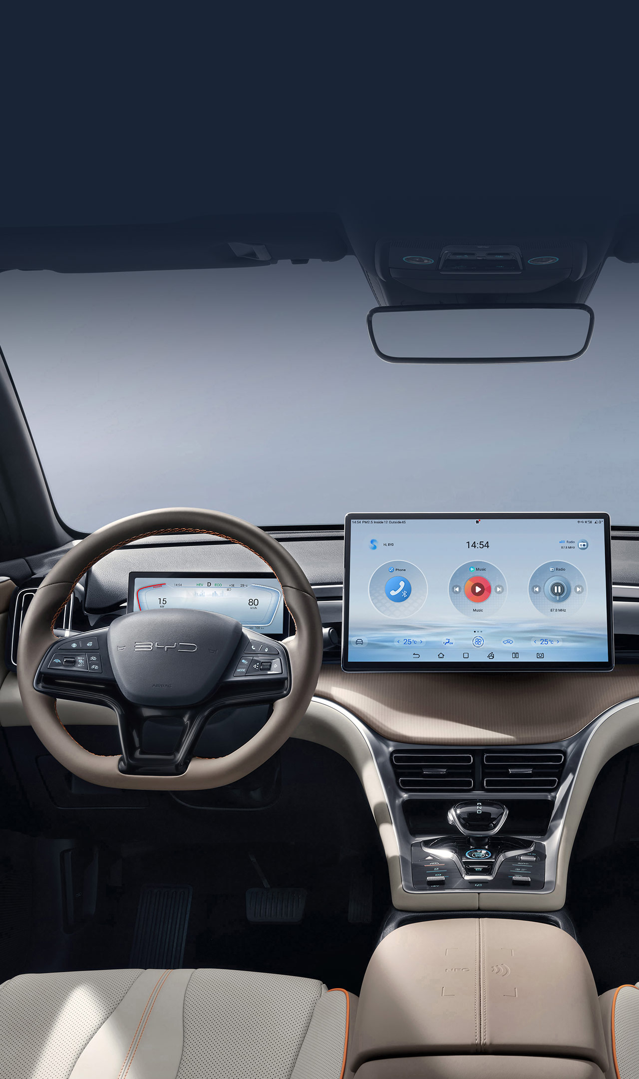 Experimenta la cabina inteligente y sistema de entretenimiento, conformado por su pantalla táctil giratoria de 12.8 pulgadas, asistente de voz “Hi BYD”, Apple CarPlay y Android Auto.